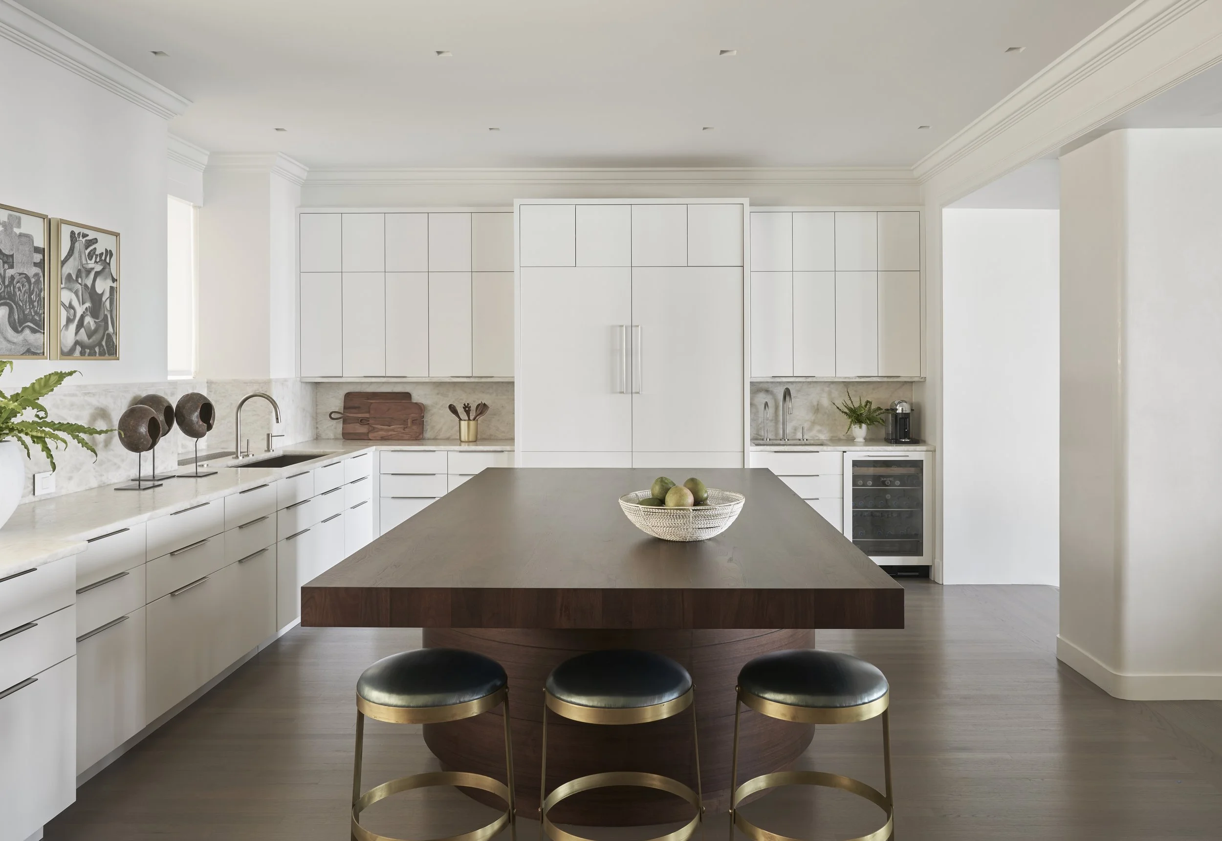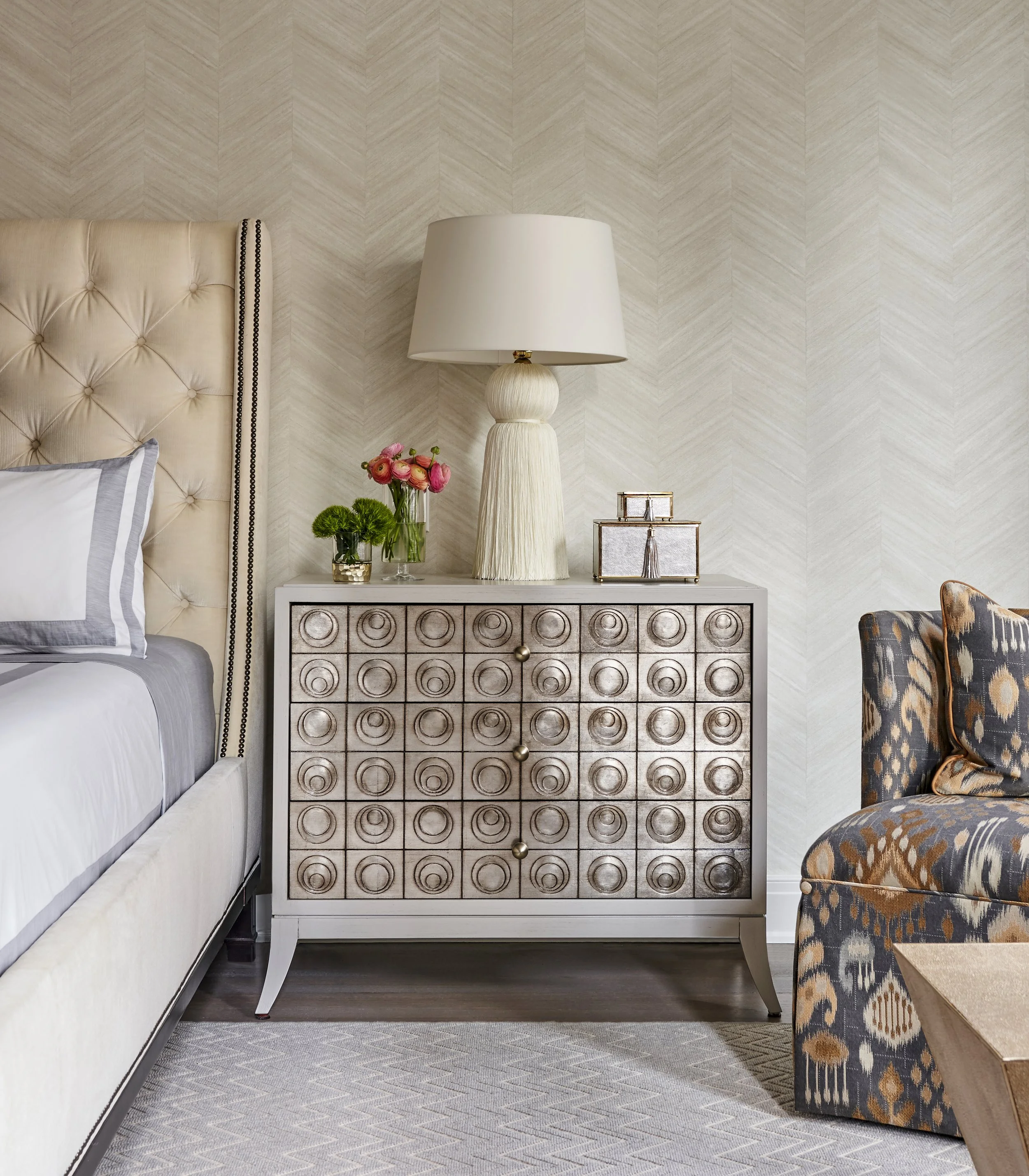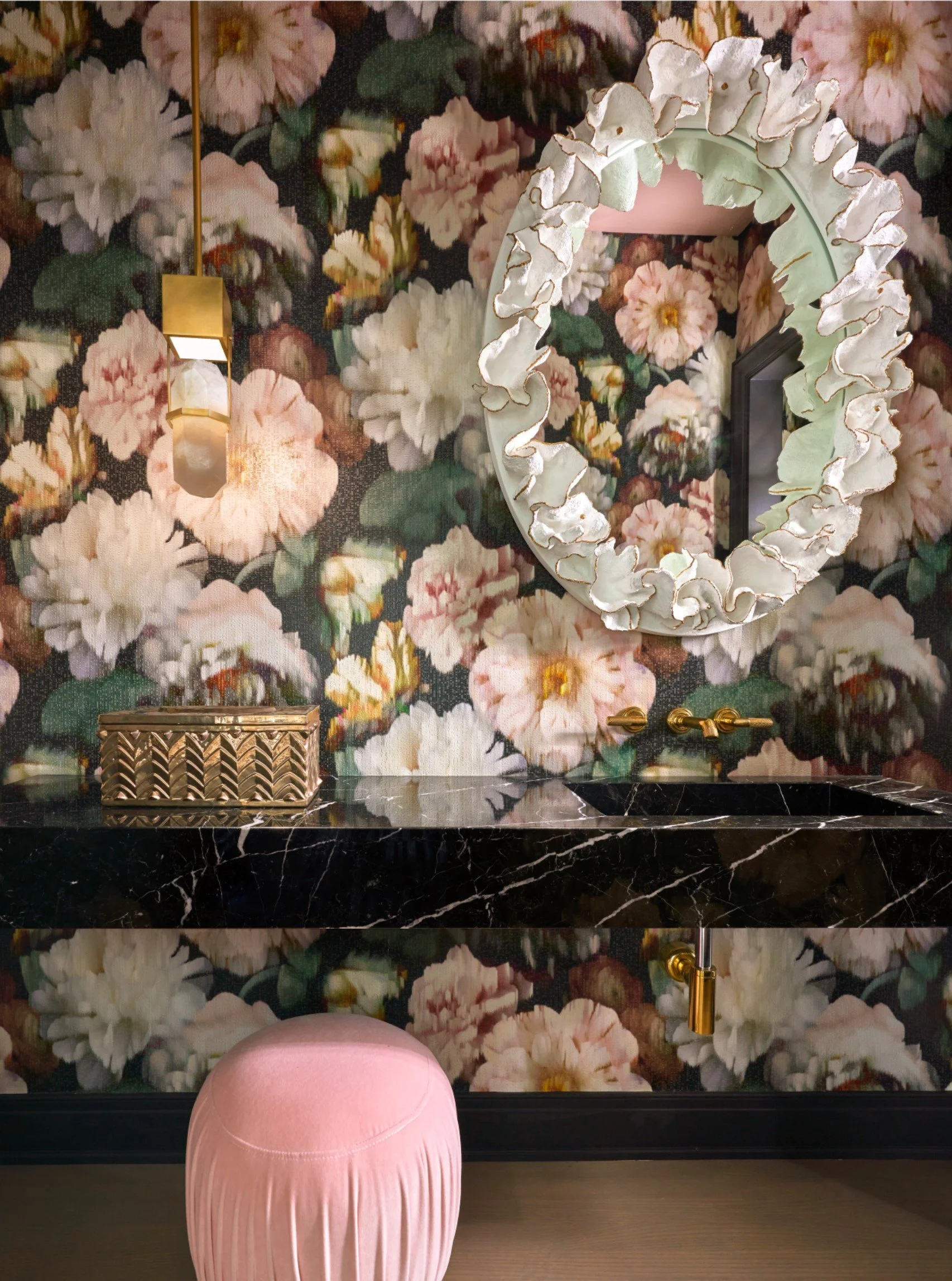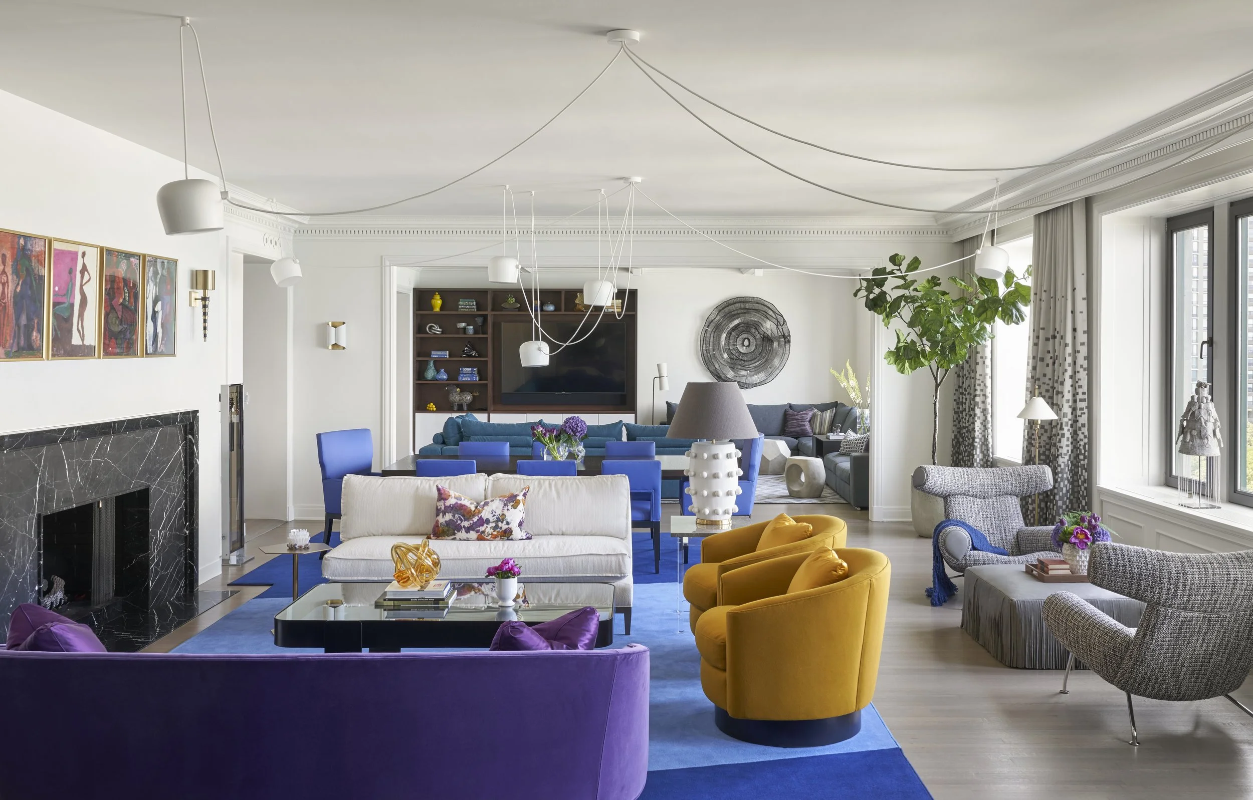 For this pre-war condo with lake views and a fancy address, the decadence is definitely in the details. We had generous proportions to play with (and play up), and were given carte blanche to bring it — the style and the statements. With ace Mike Shively on interior architecture and Tip Top commanding the buildout, steve + filip design’s focus would be on material selections, finding fixtures that pop, furniture procurement and art curation — and editing back 20 years of decor down to what would work best in this space. And there would be no holding back on saturated colors that pack a punch. Take the foyer, for example. Here, we opted to keep the original black-and-white tile floors but brought the funk in the form of a hide rug in a contrasting pattern, a gray settee placed just so beneath a feathered juju hat, and a wood acrylic side table that’s delightfully offset by a blue velvet chair. Oooh, and a set of sexy Fornasetti plates depicting Adam and Eve for added interest.